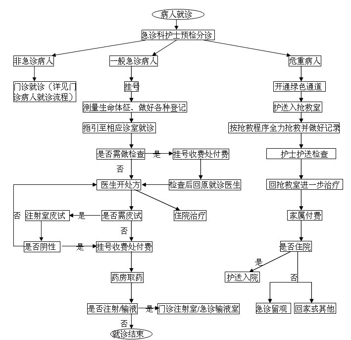 (1) 挂号:到急诊预检分诊台接受预检,根据分诊结果选择相关诊室挂号。病情危重患者可先抢救、治疗、再补挂号。