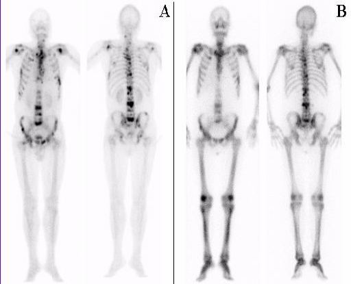 B图是同一个患者用氯化89锶治疗后6各月时再次骨显像(骨扫描),原有病灶数量明显减少,患者骨痛明显减轻,提示治疗有效。