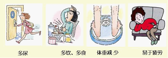糖尿病的典型症状为“三多一少”,即多饮、多尿、多食及体重减轻,且伴有疲乏无力。但是大多数病人可症状不明显。