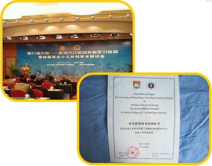 在该研讨会议上,我科室共有四篇文章参加了论文交流。参加了腹腔镜技能训练并动手做了腹腔镜动物实验,并有四人获得了由西安交通大学医院第二附属医院腔镜培训中心香港大学玛丽医院颁发的小儿腔镜技术培训证书。