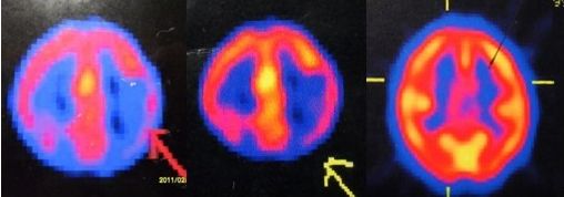 例1示:A治疗前L顶颞低灌注 B 治疗后第12月低灌注改善 C第48月ECT正常