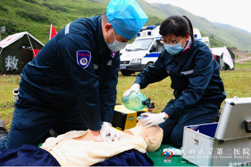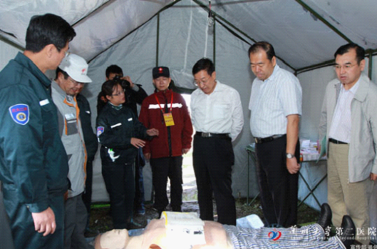 演练结束后,卫生厅刘维忠厅长带领卫生厅相关处室领导来到我院医疗队队员宿舍、临时病房及临时治疗室进行参观、检查,对我院的工作给予了高度的评价和充分的肯定,当看到我院展示的AUTO PULS 自动心肺复苏机时,刘厅长表示,其他医院可以学习我院的做法,既可以减少医务人员的工作量,同时也可以增加复苏的成功率,对伤员的抢救起到积极的作用。