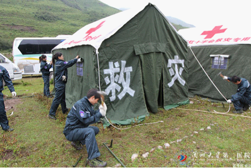 11时,医疗救援队到达演练现场后,按照演练要求,全体队员立即分工开始搭建帐篷,准备食宿及医疗救援物资,经过近一个小时的努力,我院在同时到达现场的单位中率先完成了帐篷搭建,准备好了队员的食宿。明确的分工、快速的反应、充足的应急物资及医疗设备受到了省卫厅领导及评比组专家的一致好评,同时鼓励我院医疗队再接再厉,在医疗救援演练环节中再取佳绩。