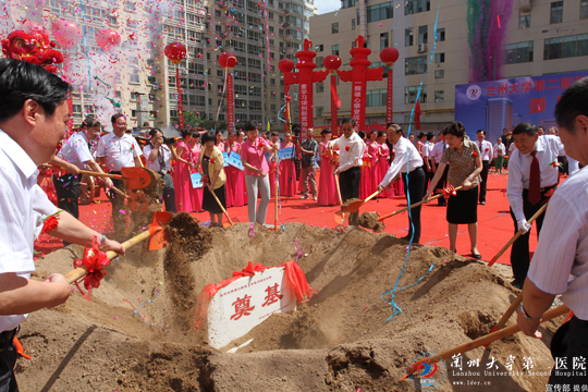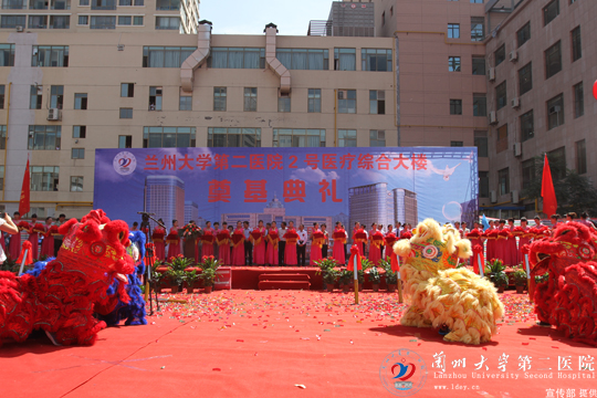 8月25日上午11时,兰大二院院内拱门含笑,彩球飘扬。伴着雄壮的军鼓乐声,踏着鲜红的地毯,兰大二院2号医疗综合楼开工奠基仪式隆重举行。