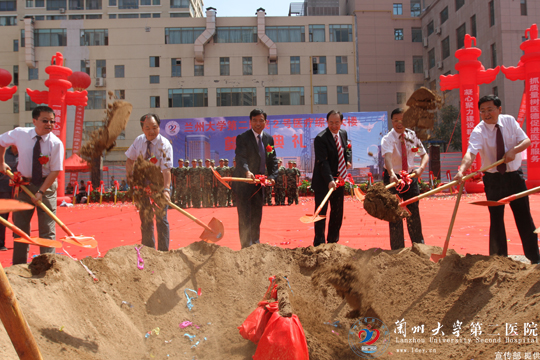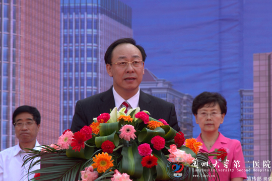 院长李玉民在仪式上致辞。他首先代表兰大二院党政班子和全体职工向出席开工奠基典礼的各位领导、各位嘉宾、国际友人和社会各界的朋友们表示最诚挚的谢意。李玉民院长指出,2号医疗综合楼的开工奠基,是兰大二院发展史上的里程碑、也是西北人民群众的一件幸事,它的建成将有力地改善广大患者的就医环境,促进医疗技术水平的提高,提供良好的科研、教学环境,为我省培养出更多的优秀医学人才,更好地为甘肃省乃至西北的广大人民群众服务,为解决人民群众“看病难、看病贵”的问题,为推进西北地区经济社会的全面发展,建设和谐社会作出更大的贡献。在上级领导的指导下,在社会各界关心下,兰大二院也一定把这项事关人民群众生命健康的民生工程建设好、实施好,一定严格按规范履行各项程序;加快工程进度,确保按时完成建设任务;把好工程质量的每个环节,确保把这项工程建设成一项经得起群众和时间考验的精品工程、样板工程;加强对工程建设的跟踪审计和监督,把这项工程打造成廉政工程、放心工程、满意工程。