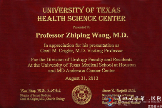 兰大二院王志平教授荣获美国德克萨斯大学休斯敦医学院暨德克萨斯大学MD-Anderson肿瘤中心客座教授