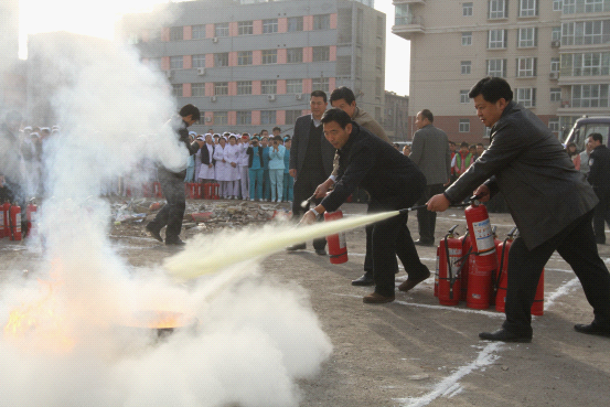 党委副书记、纪委书记、演练总指挥童明辉宣布演练开始,副总指挥刘一民首先就干粉式灭火器使用方法进行了专门讲解及要领示范,消防科人员示范了初起火灾扑救以及如何报火警,火灾中如何逃生、自救、发现火灾隐患等。针对医院工作环境的特点,演练现场模拟医院病房起火、报警、伤病员疏散、火灾现场指挥、消防灭火、伤病员急救等场景展开消防急救演练。