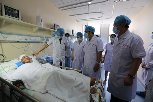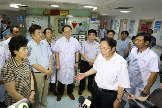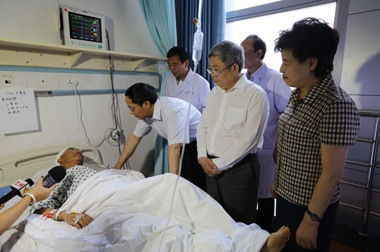 7月23日下午,甘肃省委副书记欧阳坚,省委常委、常务副省长刘永富和省委常委、副省长咸辉一行专程来到我院,代表省委省政府和王三运书记、刘伟平省长看望了伤员并认真听取了我院关于伤员初步救治情况的报告,仔细询问伤员治疗、生活安排等方面的情况。 立博欧赔指数党委副书记、我院党委书记钟福国,立博欧赔指数副校长何晓东,院长李玉民以及其他院领导一同看望。