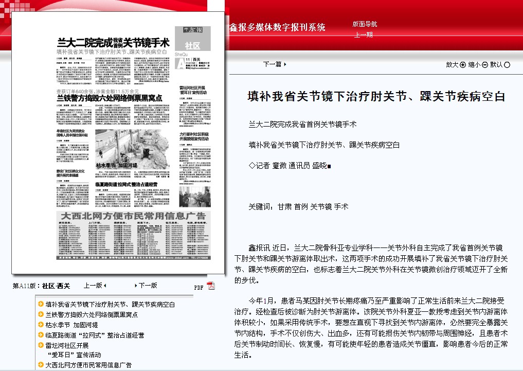 - 下一篇:【兰州日报】兰大二院完成我省首例肘、踝关节镜手术[ 02-26 ]