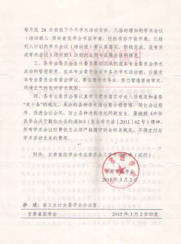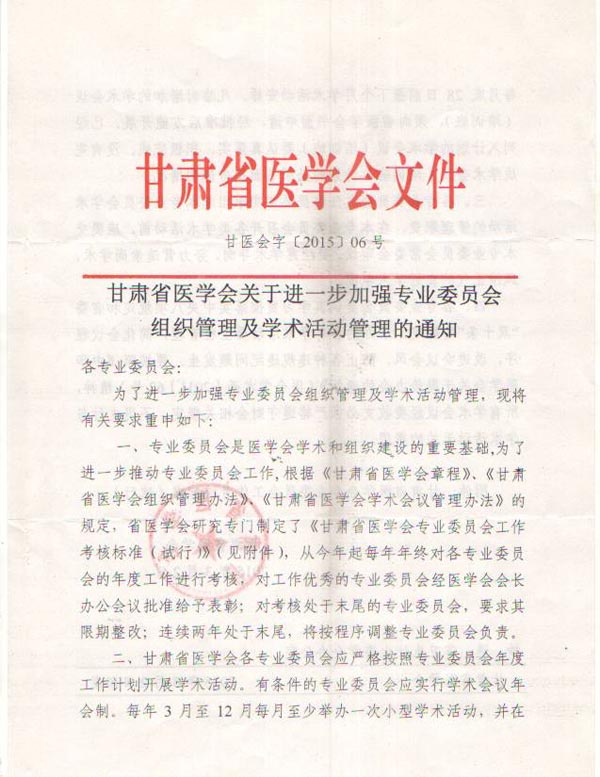 甘肃省医学会关于进一步加强专业委员会组织管理及学术活动管理的通知
