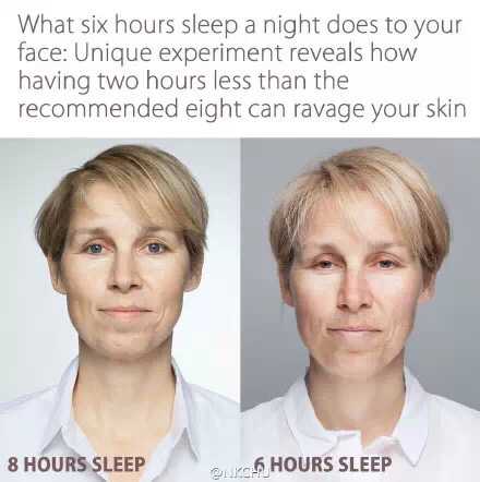 据《每日邮报》报道,46岁的Sarah Chalmers参加了英国伦敦的一个睡眠学校的实验,连续五天只睡6个小时与睡满8个小时的面容对比照(如图1)。
