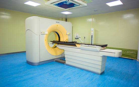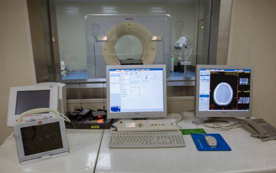 Philips的16排大孔径CT模拟定位机Brilliance TM CT Big Bore具有四维动态采集技术与门控放疗技术,该机提供85cm的超大孔径,60cm的真实扫描视野,可满足放疗定位各种特殊扫描体位的要求;配有放疗专用碳纤维平板床面,保证了扫描与治疗体位的一致性。床面定位索引定位精度达�0.25mm,为放疗定位提供了可靠的保证;高品质图像、快速图像重建、逻辑化的工作引导流程、使病人诊断和定位更精确;与放射治疗计划系统相整合,优化工作流程,从而能够实施包括虚拟射野透视模拟、容积数字重建、自动图像配准等在内的各种任务。该设备主要用于放疗的模拟定位。CT模拟机的85cm超大孔径大大高于普通诊断CT的70cm 孔径,完全可以满足各种类型肿瘤的CT定位扫描。