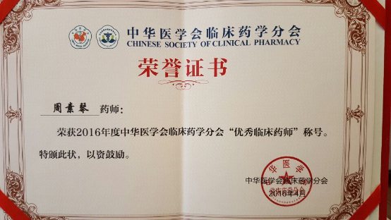 兰大二院周素琴荣获2016年度“中华医学会临床药学分会优秀临床药师”称号