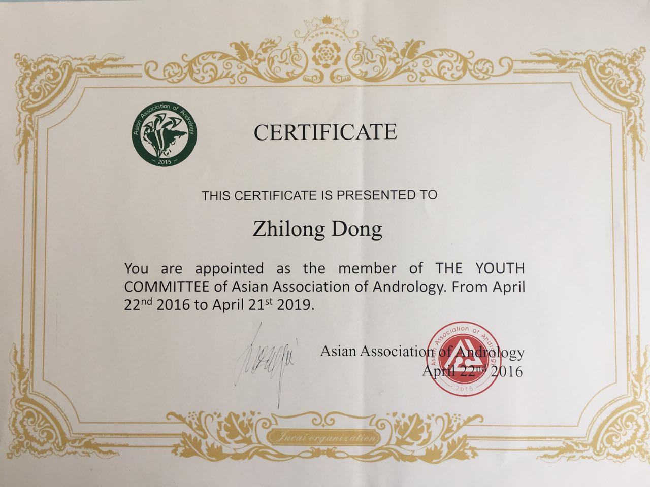 9月9日——11日召开的第三届中国医师协会男科医师年会暨第一届亚洲男科学协会年会上,我院男科代主任董治龙当选亚洲男科学协会青年委员,任期为2016年4月22日至2019年4月21日。会上,董治龙同时还获得了本次会议优秀论文二等奖。
