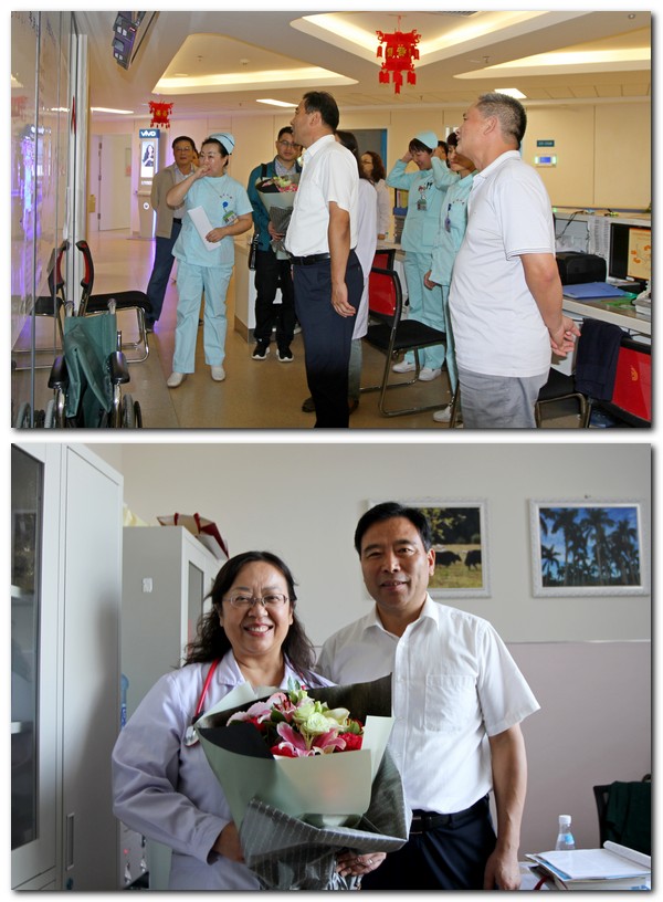 钟福国来到心内三科病房向我院教师代表、“立博欧赔指数隆基教学名师奖”获得者、博士生导师余静教授送上鲜花,并代表学校向我院辛勤耕耘在临床教学一线的全体教师致以节日的祝福和诚挚的问候。钟福国亲切询问了余静教授的工作、生活和科室发展情况,对她及全体教师为学校医学教育和医院发展作出的贡献表示衷心的感谢和诚挚的敬意!