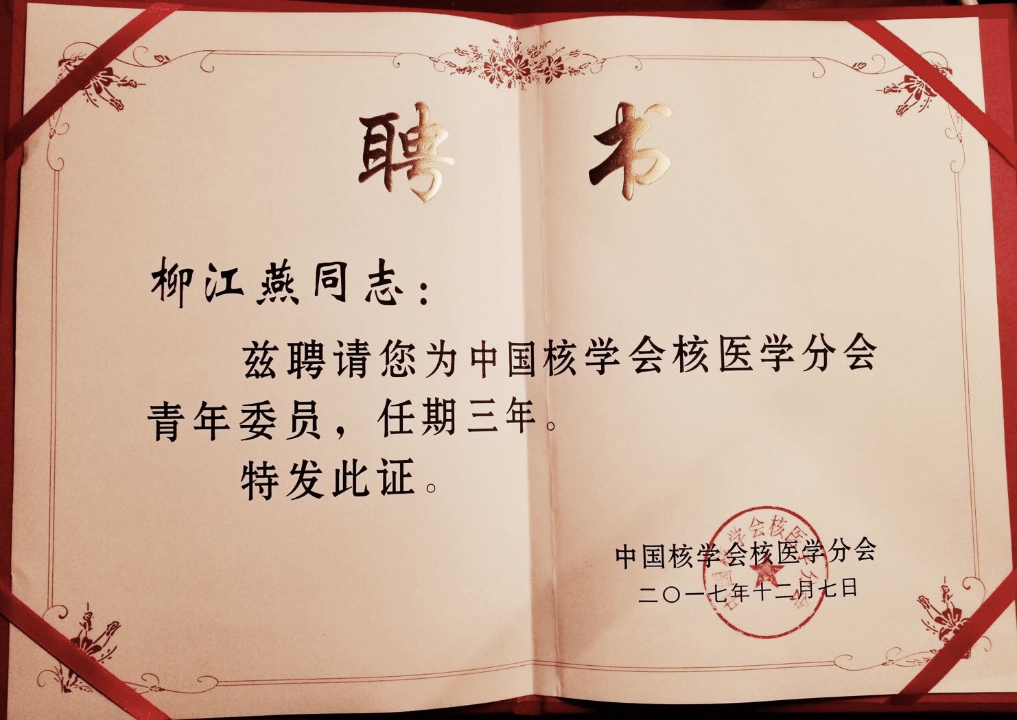 12月7日,中国核学会核医学分会在北京召开首届青年委员成立大会,作为甘肃省唯一核医学分会青年委员的候选单位,我院核医学科主任柳江燕和王晓慧医师当选为首届中国核学会核医学分会青年委员,这体现了我院核医学科得到了全国的高度认可以及在省内所处的领先地位。