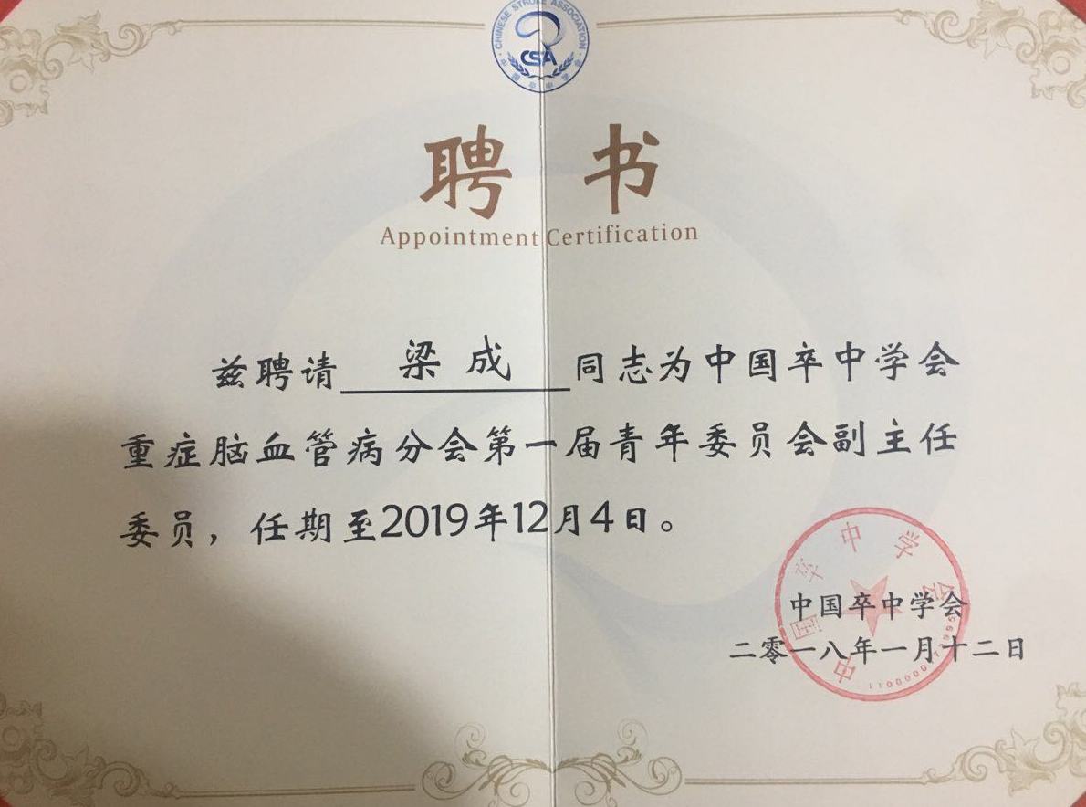 兰大二院神内ICU主任梁成当选中国卒中学会重症脑血管病分会青委会副主任委员