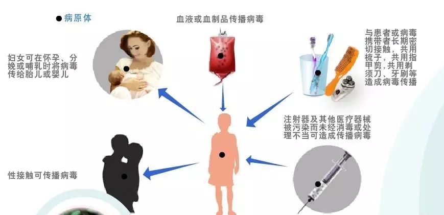 乙型、丙型及丁型肝炎通过母婴垂直、血液、体液、注射及性接触等传播。由于病毒还存在于患者的唾液、泪液、乳汁、精液、阴道分泌物等体液中,在家庭成员之间有可能因密切接触这些含病毒的体液,通过齿龈或其它伤口入血相互染病。而日常工作或生活接触,如同一办公室工作(包括共用计算机等办公用品)、握手、拥抱、同住一宿舍、共同用餐、共用厕所等无血液暴露的接触一般不会传播。