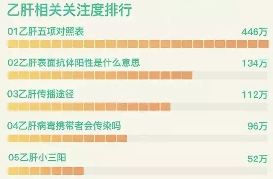 民众最关心的十大问题中,乙肝问题尤为突出;其中网络检索乙肝五项对照表的次数最多。