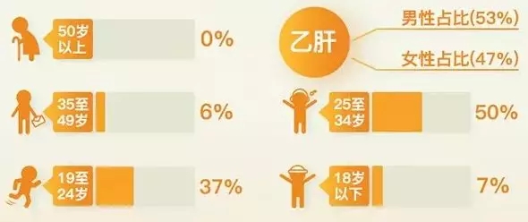 数据显示,关注乙肝、肝硬化、肝癌人群中,男性比例均略高于女性;其中搜索乙肝的人群年龄更为年轻化。