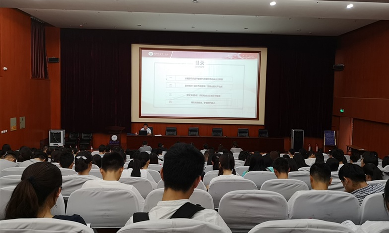 杨建文以《认真学习习近平新时代中国特色社会主义思想,增强历史担当,争做时代新人》为题,站在历史发展的角度,讲解了学习习近平新时代中国特色社会主义思想的重要性,鼓励青年学生提高学习的自觉性和积极性。他结合马克思主义政党建设的三个主要原理,深入阐释了十九大报告提出的“坚持党对一切工作的领导,坚持全面从严治党”的时代意义。他重点介绍了文化的含义、概念、特性以及我国独特优秀的传统文化、革命文化、社会主义先进文化,强调“文化自信是更基本、更深沉、更持久的力量”、“我们有充分理由和充足底气讲文化自信”,鼓励医学生肩负起文化传承的责任。他勉励大家深入学习习近平新时代中国特色社会主义理论,勇担新时代的历史重任,成为新时代的弄潮儿,永葆积极向上的精气神,为实现健康中国战略努力奋斗。