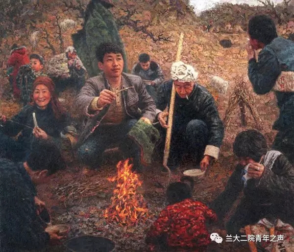 (图为画家王建顺创作的油画《田野》,艺术再现上世纪七十年代习近平和梁家河村乡亲们在一起的情景。)