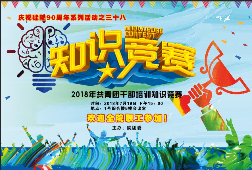共青团干部培训知识竞赛将于2018年7月19日15:00,在综合一号楼五楼会议室举行,请全体团干准时参加。欢迎全院职工及实习生观摩比赛。