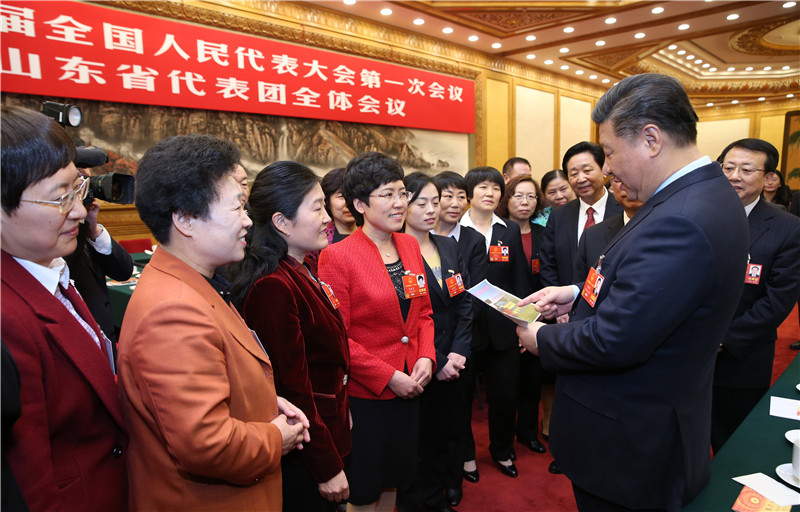3月8日,中共中央总书记、国家主席、中央军委主席习近平参加十三届全国人大一次会议山东代表团的审议。