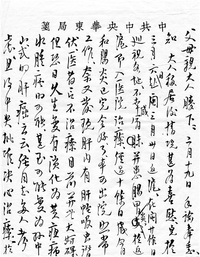 近日住院摆脱事务,故写此长信禀报,请双亲宽心。此请万福金安。另张茜开车伤牙已补好,请母亲放心。