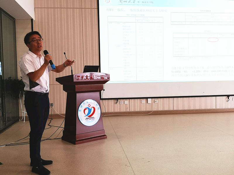 第二临床医学院质控科副科长杨飞从近10年来立博欧赔指数医学本科招生分数线与近5年来立博欧赔指数医学生执业医师过关率对医学本科教育的质量进行思考,通过卡方检验对比分析第一、二临床医学院近5年的执业医师过关率。他也分享了自己云课堂的部分内容,鼓励大家改变传统教学方式,提出以“变轨超车、弯道超车”为主的新目标、新要求,强调通过不断创新,提高医学本科教育的内涵建设。