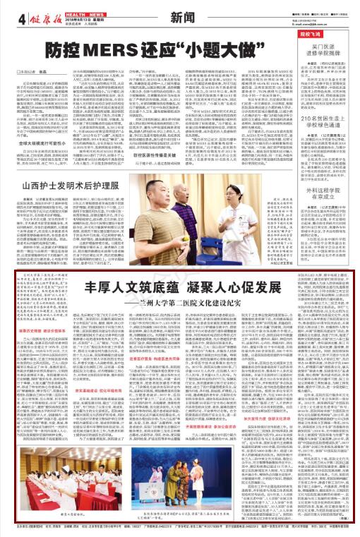 医院积极做好宣传报道工作。创建院报《兰大二院报》、院刊《萃英》、国家级期刊《医院与医学》,2012年荣获“全国医院宣传与文化创新优秀报刊”。近5年来,国家及省内主流媒体报道医院新闻1000余篇,院内发布稿件、信息约5000余篇(条),组建130多人的新闻通讯员队伍。医院积极开拓兰大二院中英文官方网站、微信公众平台、官方微博等新媒体外宣平台,其中,微信粉丝数已超过16万余人。建立医院新闻发言人制度,与主要媒体开展合作,围绕热点问题主动发声,开展健康科普,介绍医疗知识,增强医院文化的辐射力。