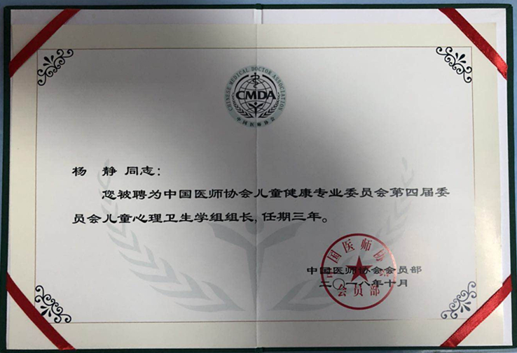 近年来,我院在儿童健康医学和儿童心理卫生领域的学术影响力不断提升,目前,杨静还担任中国医师协会儿童健康专业委员会常务委员、中华医学会儿童行为发育学组委员会委员、中国心理卫生协会心理治疗与心理咨询专业委员会委员、《中国儿童保健杂志》编委会委员等职务,充分体现了我院在相关领域已达到省内领先。