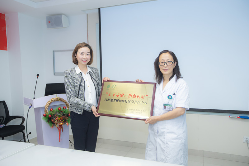 会议中,中国初级卫生保健基金会秘书长李晓颖为我院授予丙肝患者援助项目医学合作中心牌匾。今后,低保患者以及低收入患者可到我院肝病科门诊处咨询,经项目医师医学评估后,由主要负责医生帮助患者准备相关资料,包括检查报告单、低保证明、低收入证明等,通过基金会审核后,便可以领取援助药物。