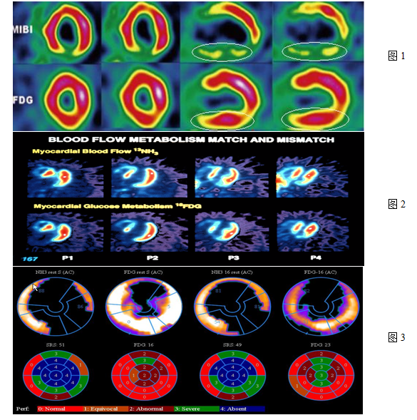 图 1 心肌梗死患者心肌血流灌注MIBI显像提示下壁、后壁心肌梗死;FDG代谢显像显示相应部位心肌存活。为临床冠脉介入治疗、挽救存活心肌提供依据。