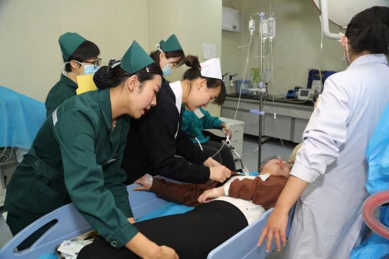 演练中,分诊护士接到“120”急救中心电话,第一时间上报科主任和护士长,同时,立即启动紧急预案,联系相关部门做好急救准备。5分钟后,受伤患者陆续抵达我院,急门诊护士利用标识积极做好分诊及登记工作,内科医生及三名急诊骨干立即查看患者伤情,各诊室内包扎固定、清洁伤口,对重伤患者给予心肺复苏、心电监护、气管插管接呼吸机等一系列抢救工作。经过近一个小时的紧急救援,受伤患者病情得到控制,情绪也逐渐平稳,门急诊医护人员还给予受伤患者心理安慰和人文关怀,带给他们家人般的温馨和关爱。整个抢救现场责任明确,配合默契,各项检查、治疗、抢救操作规范,有条不紊。
