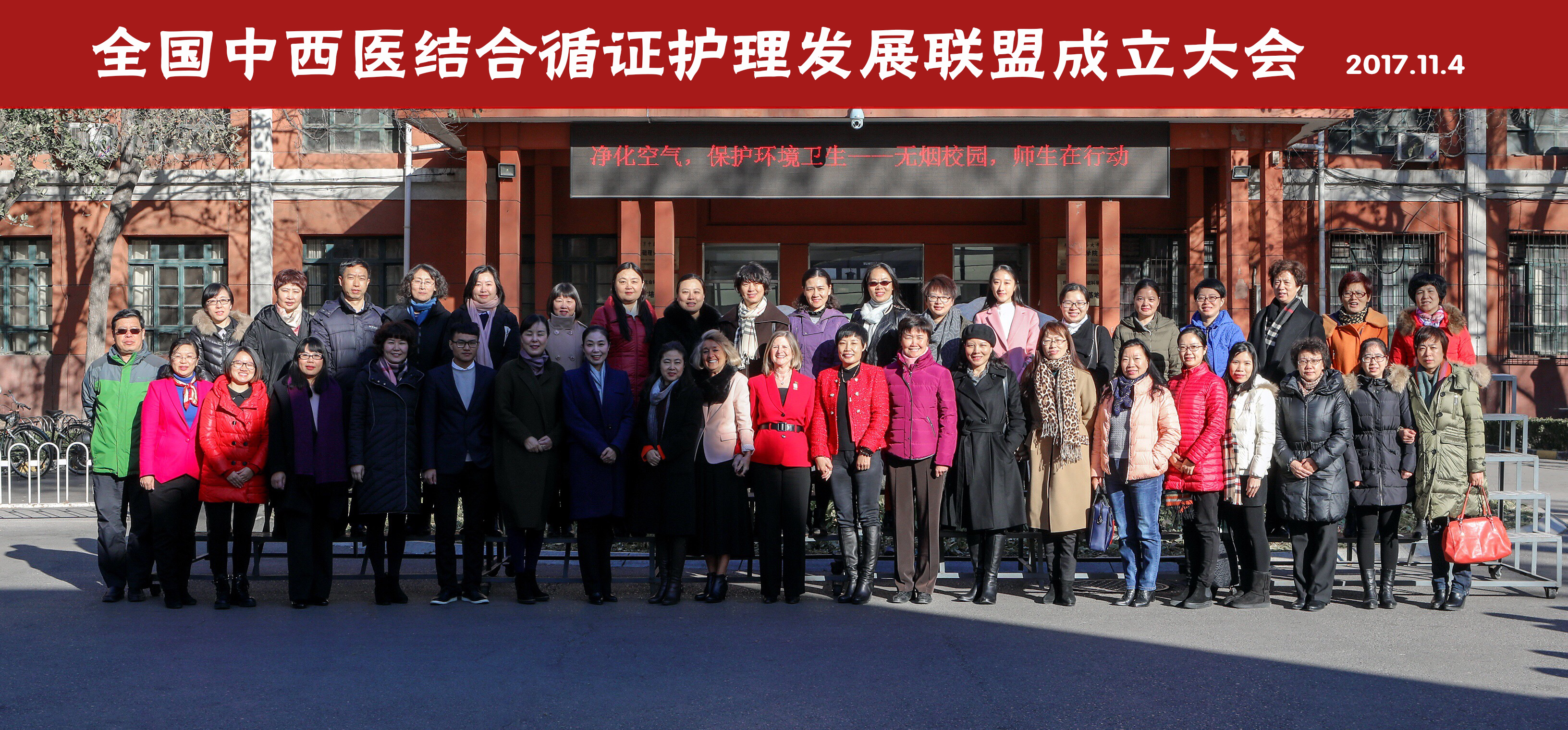 全国中西医结合循证护理发展联盟由北京中医药大学护理学院、香港大学深圳医院护理部、北京中医药大学东直门医院护理部、中日友好医院护理部及TMR整合护理学编辑部五家主席单位联合发起。经联盟主席单位审核,在全国范围内共吸纳联盟成员单位34家,其中高等护理院校15家,医院19家。联盟成立大会邀请加拿大安大略省注册护士协会首席执行官Dr. Doris Grinspun女士和最佳实践指南中心主任Dr. Irmajean Bajnok女士、中国中医药出版社教材中心主任沈承玲女士作为嘉宾,与会人员有全体联盟单位成员以及“临床循证护理的推行与实践”培训班全体学员。
