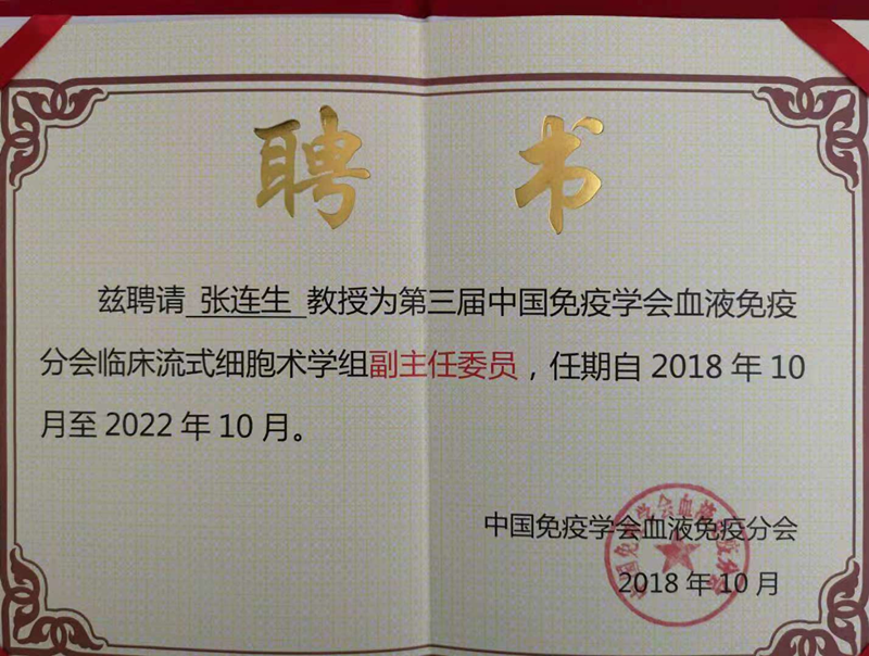 兰大二院血液科张连生教授连任中国免疫学会 血液免疫分会临床流式细胞术学组副主任委员