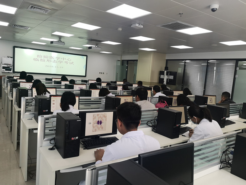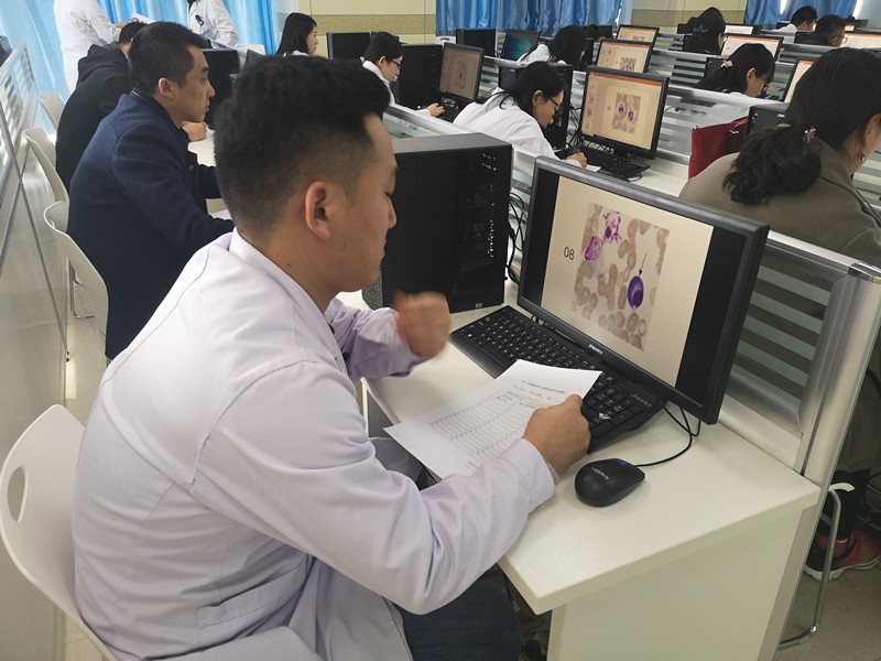 在考核中,首先进行的是形态学电脑阅片,每位考核者必须完成50张显微镜下血液、尿液、粪便等图片的辨识,最后进行血液推片、染片、显微镜检查血细胞形态、分类等实际操作。同时,要求每位检验者严格按照规范要求进行阅片和实际操作,每一步操作,每一道工序都在考核老师们的细心观察之中,扎实的专业知识、熟练的操作技能和良好的心理素质是考核的主要内容。