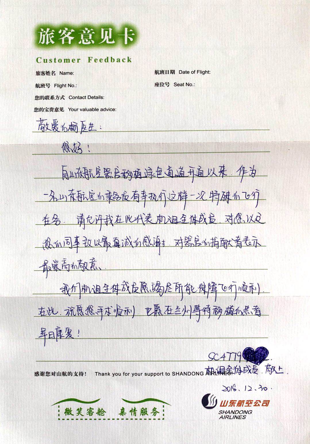 8点30分,摘取手术顺利结束。杨含腾立即赶往新郑机场,搭乘9:50最早的航班,飞往兰州。当高空航行时,杨含腾展开了为保障好本次航行的山东航空公司信件,信件中质朴而真诚的话语,让即使从医多年的他依然眼眶湿润了,生命有始终,人间最值得。