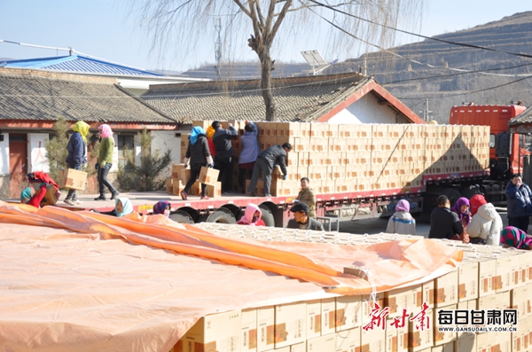 静宁县三合乡润民农业小杂粮加工基地生产的胡麻油、小杂粮绿色、有机、无污染而深受消费者欢迎。图为工人们正在装车。 每日甘肃网记者王彬摄