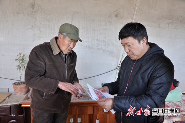 兰大二院派驻静宁县三合乡段渠村第一书记赵成钢(右)走进建档立卡贫困户刘汉荣(左)家,详细询问他早期肿瘤的病情。每日甘肃网记者 王彬摄