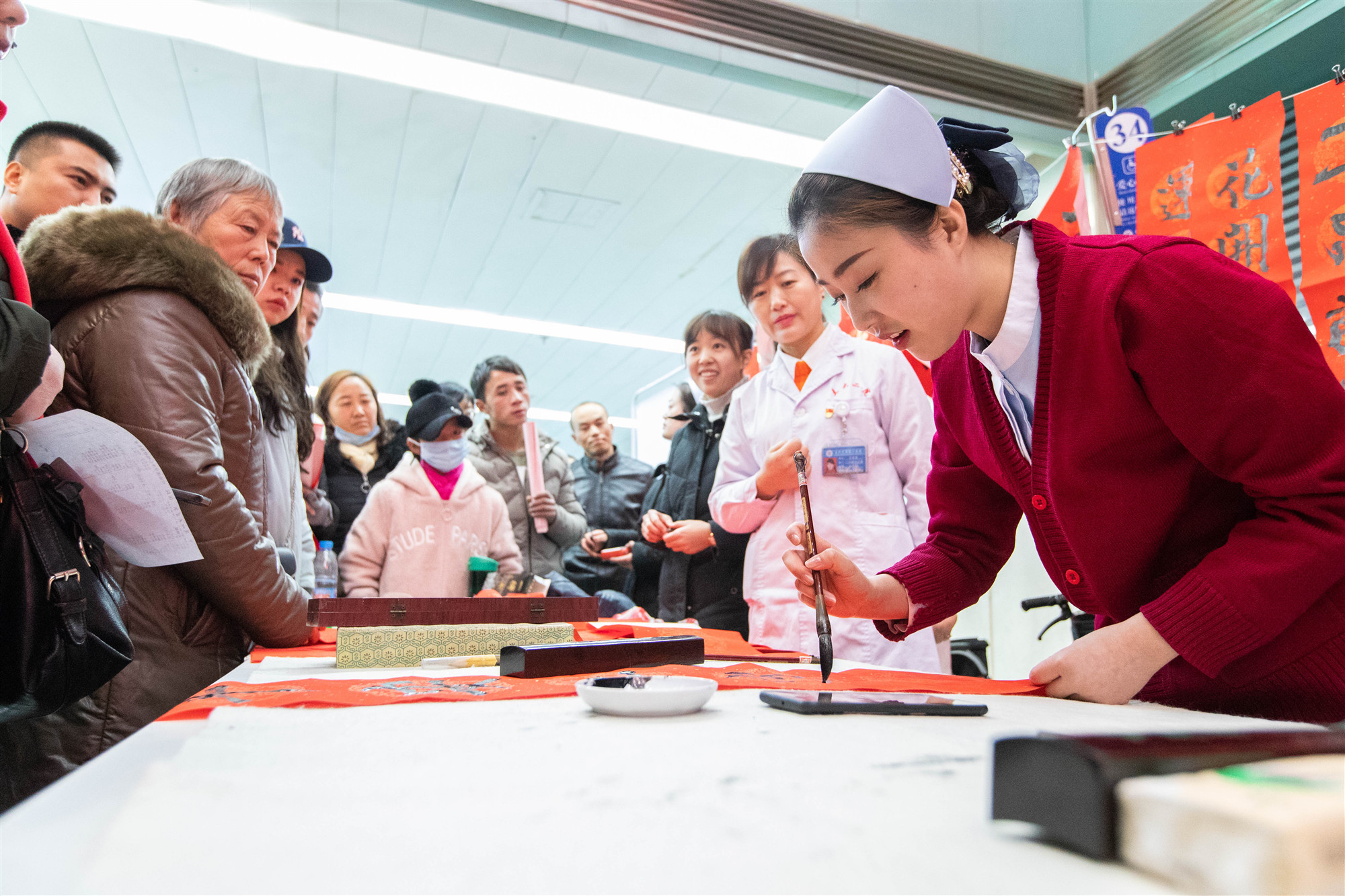 大红的对联喜气洋洋,浓浓的年味扑面而来,虽是隆冬时节,天寒地冻,但在兰大二院门诊部大厅却是人头攒动、笔墨飘香、年味十足。2月1日,由门诊部护士晁悦握笔开展的“迎新春·写对联”活动正在火热进行中……