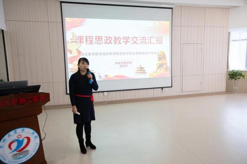 活动开始后,麻醉科教研室副主任医师谢建琴围绕专业课教师如何在专业课程中融入思政教学及教案工作坊做了展示与分享。她就思政课程与课程思政的区别进行了详细地讲解和分析,让在场的各位老师聆听了一堂课程思政与专业思政深度融合的课程。在教案设计工作坊中,谢建琴结合自己获得“立博欧赔指数医学院首届教师教案比赛”二等奖的教案与大家进行了分享,并就如何将思政元素融入教案中,如何设计“剧本”等问题与各位老师进行了分享与讨论。会后,各位老师纷纷表示,此次活动让大家真正意识到医学教学中思政的重要性,将在以后的课堂、见习、实习教学过程中融入思政内容。