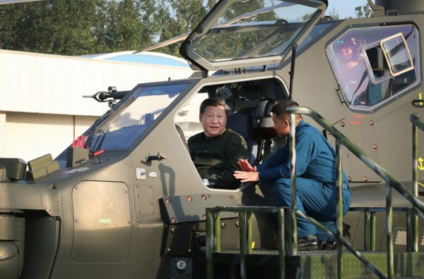 习近平察看了部队主战武器装备。武装直升机技战术性能怎么样?实际操作中好不好用?有没有需要改进的地方?习近平问得很仔细。直-10武装直升机是我国自主研制的第三代战机,习近平登上该型直升机,佩戴专用头盔,亲自操控机载武器及观瞄系统,了解有关装备情况。