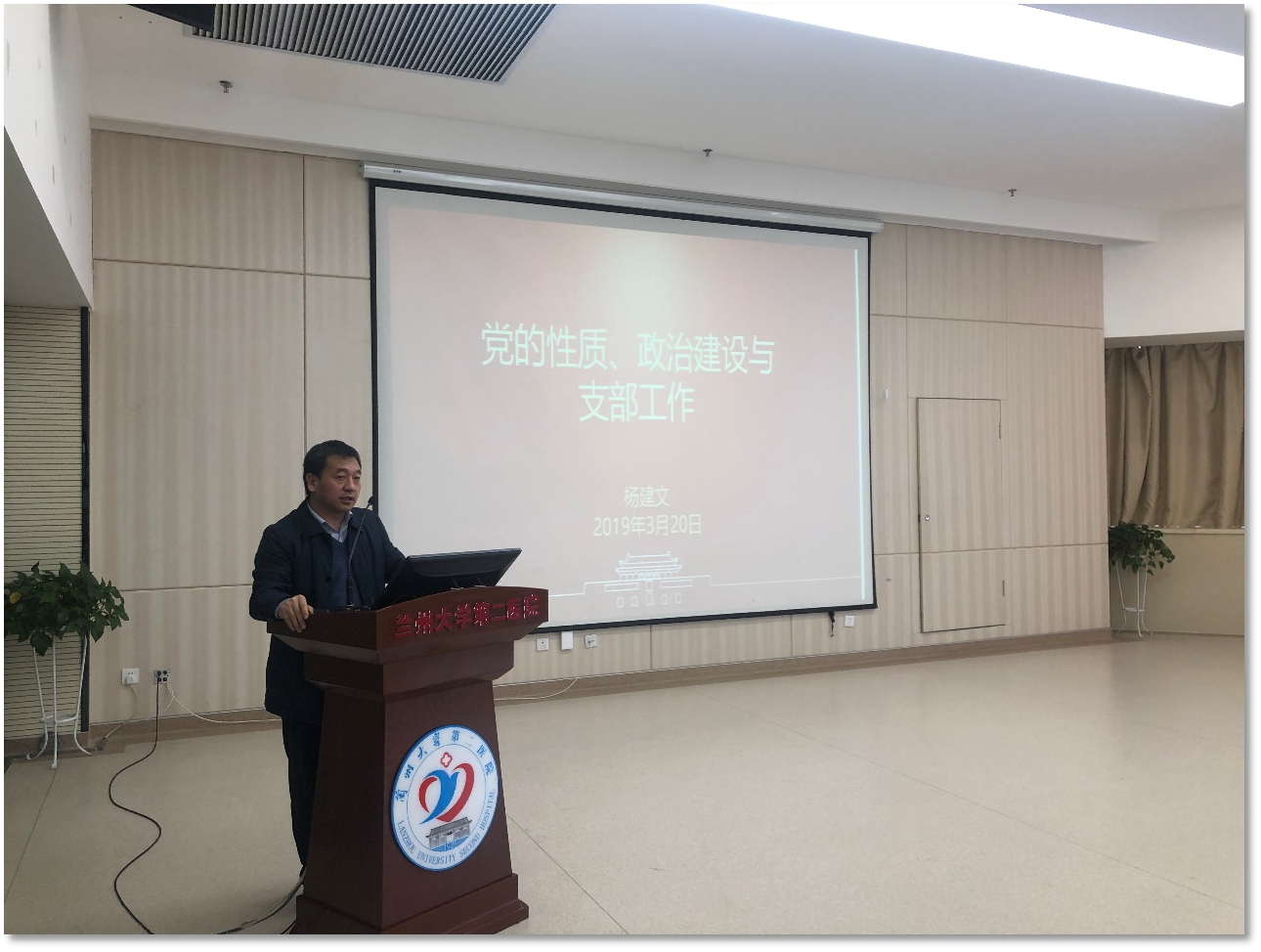 为深入学习贯彻习近平新时代中国特色社会主义思想和党的十九大精神,深入推进“两学一做”学习教育常态化,3月20日下午,机关党总支第六党支部邀请党委书记杨建文在会议室(五),为支部全体党员、预备党员、入党积极分子及医务处、门诊部的同志共计90余人,讲了一堂题为《党的性质、政治建设与支部工作》的精彩党课。会议由机关党总支第六党支部书记何继瑞主持。