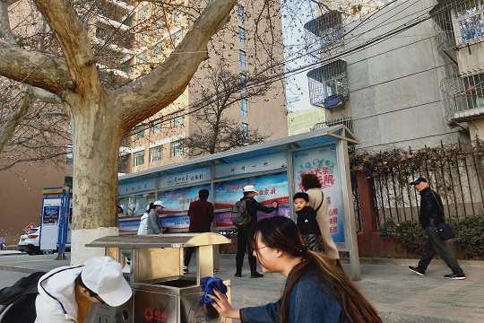 时间不知不觉流逝着,在下午的活动中,另外四个组在完成交接任务并向组员分发了工具和作了一下简短的介绍之后,同学们在组长的带领下纷纷走向其他的校园的角落中,他们认真用蓝色的毛巾拂去公共座椅上的灰尘,仔细的清理着因为施工而略显“脏乱”公共凉亭。看着纷乱的自行车,他们伸出手,将这些排错队的自行车回归原位,重新摆放整齐。在活动过程中,我们受到了一些大爷大妈的好评,他们为我们的行为感到欣慰与赞赏。