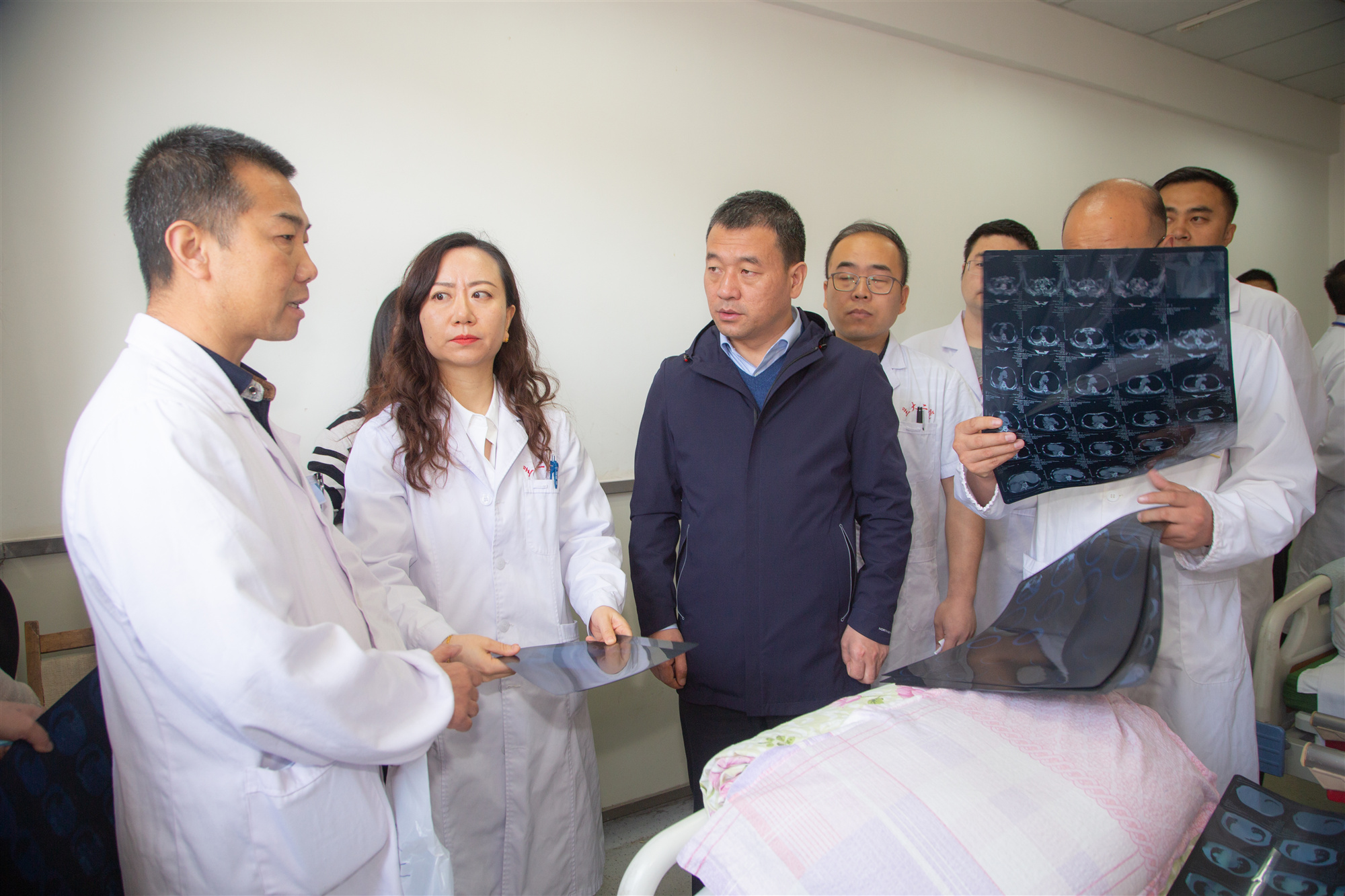 在舟曲分院党政领导的陪同下,杨建文一行对骨科、普外科、内科进行了行政查房。在普外科,杨建文看望了发育迟缓、重度营养不良的女性胆囊炎患者小王(化名),27岁的小王身高159厘米,体重却只有60斤。杨建文得知小王在舟曲分院手术风险大、术后恢复困难后,现场为患者开通绿色通道,建议将患者转入我院,进一步明确发育迟缓病因后进行手术。