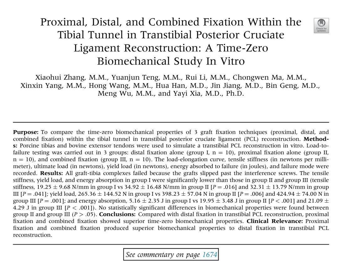 近日,我院骨科中心夏亚一教授团队在国际运动医学权威杂志《Arthroscopy: The Journal of Arthroscopic and Related Surgery》发表题为“Proximal, Distal, and Combined Fixation Within the Tibial Tunnel in Transtibial Posterior Cruciate Ligament Reconstruction: A Time-Zero Biomechanical Study In Vitro”的原创性文章。该文我院为通讯单位,夏亚一教授为通讯作者,骨科硕士研究生张小辉和骨一科滕元君医师为共同第一作者。