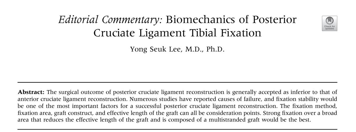 在运动损伤领域,相比于前交叉韧带重建,后交叉韧带(Posterior Cruciate Ligament,PCL)损伤的相关研究及临床经验相对匮乏,手术重建疗效欠佳。夏亚一教授团队在总结多年来手术经验及查阅大量文献的基础上,创新性地提出PCL重建胫骨隧道近端固定和联合固定方式,并通过体外造模及生物力学研究,证实其有更优的生物力学性能,为PCL重建术胫骨端移植物的坚强固定提供了更优的选择。韩国运动医学专家Yong Seuk Lee教授特为此文发表述评文章,对本研究成果给予了高度的评价及肯定。