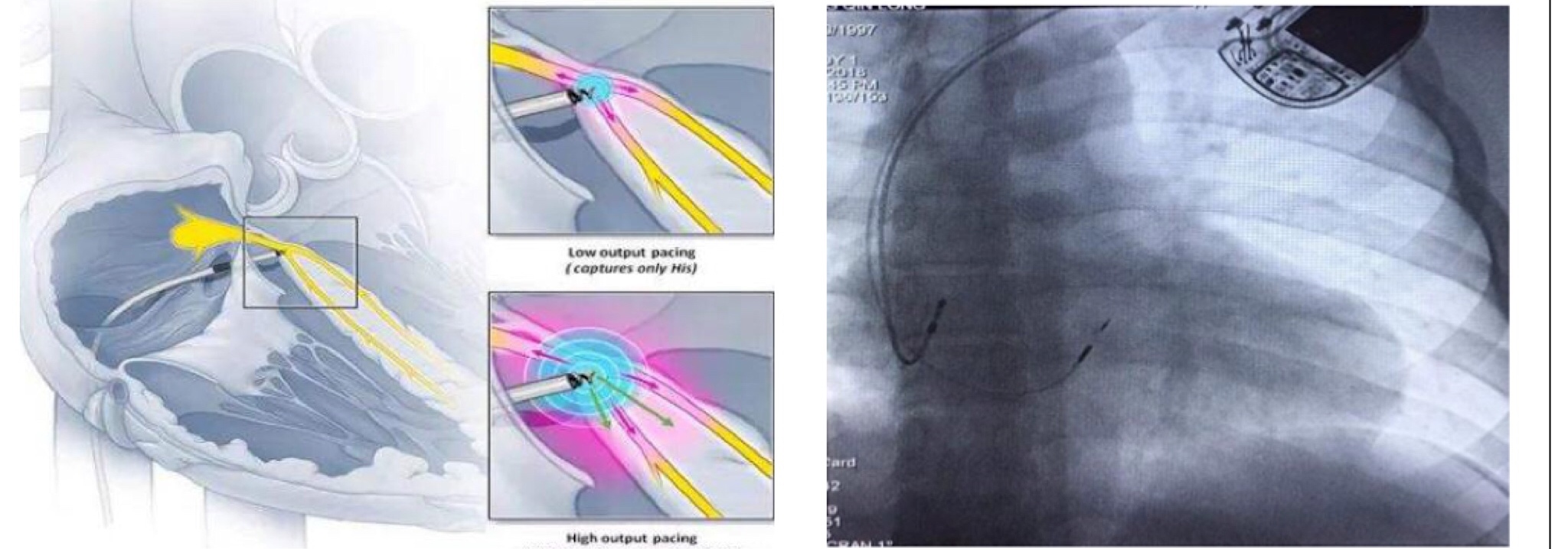 希氏束起搏示意图 X线投射植入HBP起搏器